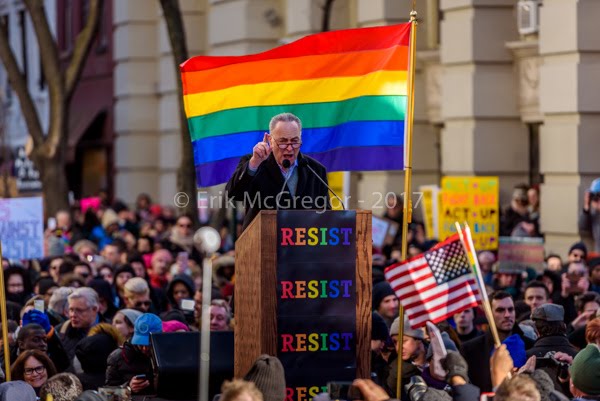 “Let me remind people of why we’re here,” U.S. Sen. Charles Schumer said. “The pioneers at Stonewall were alone, but they fought and fought and eventually they won. We are gonna do the same thing!” Schumer also led chants of “Dump Trump” from the podium as a rainbow flag waved behind him.