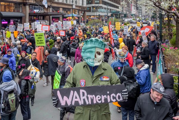 New York, NY – Hundreds took to the streets as antiwar and social justice groups organized a demonstration on April 15, 2018 in New York City, with a rally at Herald Square and march to Trump Tower as part of national regional spring actions throughout the country against the US bombing of Syria and opposing endless U.S. wars.