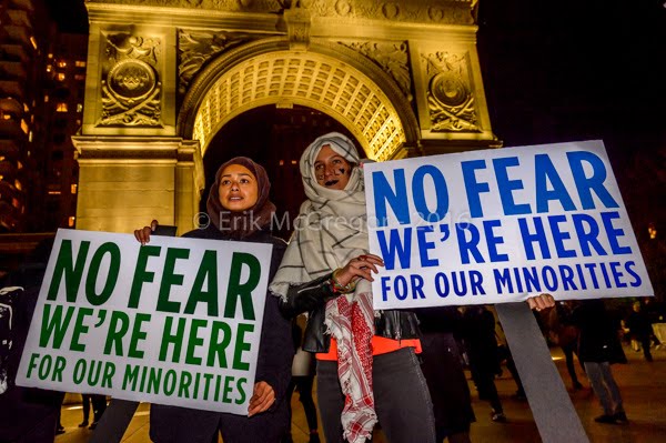 An estimated 4,000 demonstrators gathered in Washington Square Park, huge numbers of young people. Many of them women to stand in solidarity with the groups that President-elect Donald Trump demonized, ridiculed and threatened during his run for the White House. It was part protest, part support group.