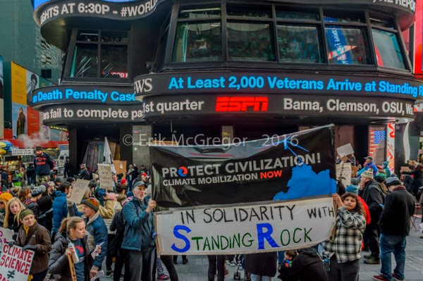 NEW YORK, NY– On December 4, over 2000 veterans, including Hawaii Rep. Tulsi Gabbard, will join the water protectors in North Dakota in opposition to the militarized police force. As a sign of solidarity with water protectors as 2000 veterans deploy to North Dakota, The Climate Mobilization, as allies, peacefully gathered in Union Square and then began to march to Columbus/Indigenous Circle at 3 pm, where CNN’s New York HQ are located. Activists demand that CNN and the rest of the mainstream media end the white-out on the events at Standing Rock.
