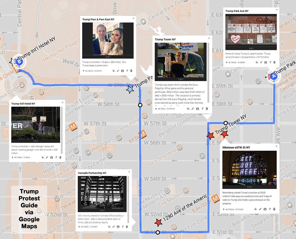 The route for the DUMP TRUMP CRAWL highlight the visible web of Trump’s conflicts of interest, displaying his public assets in the form of a ‘map of the stars,’ albeit the stars in this map are the questionable Trump real estate holdings and his special interests. Seven of Trump’s midtown Manhattan owned or branded properties will be featured in the route, including:
