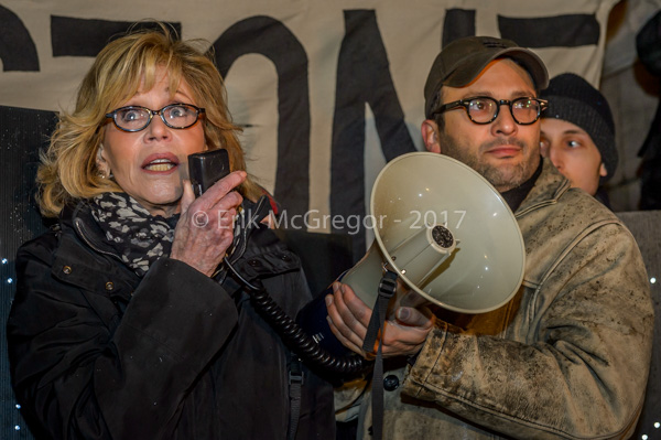 New York – Hundreds of New Yorkers joined Actress Jane Fonda and Film Director Josh Fox in the evening of January 24, 2017 at Columbus Circle in New York for a rally and march to Trump Tower in a massive peaceful protest after Trump signs orders to advance Keystone XL and Dakota Access Pipelines
