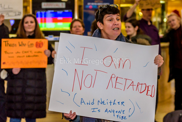 New York, NY – On Sunday February 5th 2017, people with disabilities, parents, caregivers, teachers, and allies gathered at the clock in Grand Central Station to protest the nomination of Betsy Devos as secretary of education. Devos is threatening the most basic civil right of disabled people, many children with disabilities are at risk of losing their right to an education. Devos has said: “That is a matter that is best left to the states.”