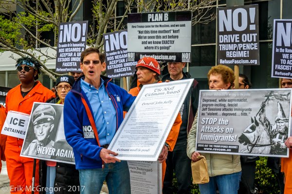 The press conference was followed by a procession to 26 Federal Plaza, Manhattan, the U.S. Federal Building which houses an Immigration Enforcement and Removal Operations Field Office, the participants will present the Adolf Eichmann Award to Department of Homeland Security Secretary John Kelly for “for striking terror into the hearts of Muslims everywhere by enforcing Mein Trumpf’s January 27, 2017 Muslim Ban,” and “for his tireless effort to begin construction of the border wall by the end of summer 2017.”