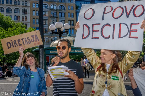 New York – Supporters of the Brazilian Democratic Regime gather at Union Square, New York on May 21, 2017; to echo the voices of those demanding Elections in Brazil immediately.