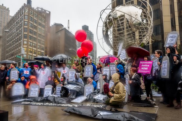 The action is sponsored by a coalition of domestic and international organizations, including Rise & Resist, Health Global Access Project (Health GAP), Center for Health and Gender Equity (CHANGE), African Services Committee, International Women’s Health Coalition (IWHC), ACT UP New York, AVAC, STOPAIDS (U.K.), Metro New York Health Care for All, Women’s Health & Reproductive Rights (WHARR), Just Treatment (U.K.), VOCAL-NY, and ACT UP London.