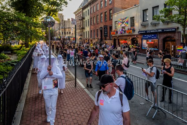 49 veiled “Human Beings” memorialized the victims, each of whose name will be read by community leaders. Patrons of 30 partnering LGBTQ bars and clubs, including Henrietta Hudson, Stonewall Inn, Rockbar, Ty’s, Duplex, Hangar, Boots and Saddle, Cubbyhole, Julius, Phoenix, Nowhere, Eastern Bloc, the Monster, Therapy, Marie’s Crisis, Ninth Avenue Saloon, Metropolitan, and Club Evolution, among others, walked silently in groups to meet outside Stonewall Inn for a solemn yet ultimately celebratory event ending in a dance party with DJ’s Christy Love and W. Jeremy. Afterwards, the public was invited to meet up at partnering bars throughout New York City for drink specials and community-building.