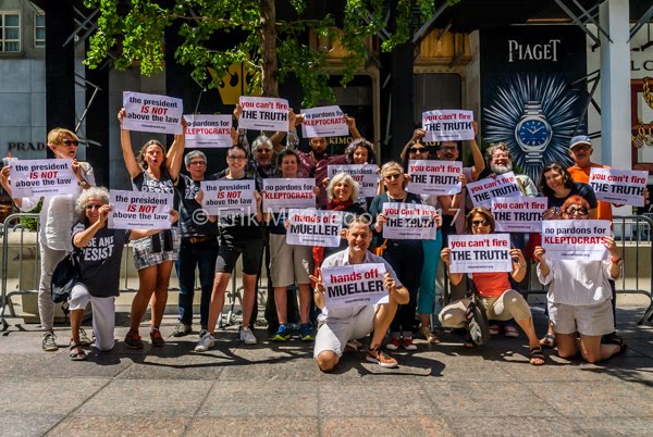 Members of Rise and Resist, a NYC-based direct action group, carried signs stating ‘You can’t fire the truth’, ’No pardons for kleptocrats’, and ‘Hands off Mueller’ while chanting inside the Trump property and distributed leaflets conveying a simple, direct message – Trump cannot be allowed to obstruct justice.