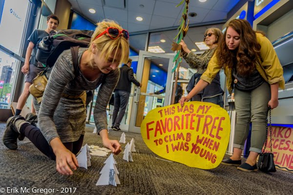 After the presentation and reading, the group placed small trees inside Chase Bank with the story of Camp White Pine to inform customers and staff that Chase Bank is financially supporting the destruction by Energy Transfer Partners that harms our water, land, air and climate and abuses Indigenous nations and many other communities far and wide.