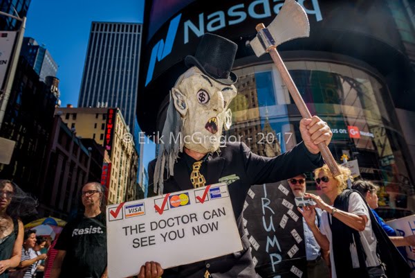 New York City – Members of New York City organizations affiliated or allied with Health Care for America Now (HCAN), a nationwide campaign to defend federal health care programs led a “Funeral March to Bury TrumpCare” in Times Square on September 23, 2017; carrying tombstone props, a coffin, led by a Grim Reaper, to call on US Senators to Reject “Graham-Cassidy” bill to repeal the Affordable Care Act, Gut Medicaid, Limit Family Planning Services, and Weaken Consumer Protections.