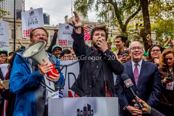 New York, NY – Writers from DNAinfo and Gothamist, along with elected officials and Writers Guild of America, East members and staff, held a rally on November 6, 2017 at City Hall Park in New York to fight for the unionized editorial employees at DNAinfo and Gothamist. On November 6, 2017; the publications’ owner – right-wing billionaire Joe Ricketts – announced that he had shut down the popular local news sites and bragged that the employees were to blame for his decision because they exercised their right to unionize.