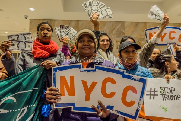 New York, NY – In time for Thanksgiving, New Yorkers, members of New York Communities for Change, Strong Economy for All, and other progressive advocacy groups delivered a special message to Trump: “Your tax plan will gobble up our communities”. On November 22, 2017; they delivered turkeys stuffed with cash to the Trump building in Wall Street, highlighting how Trump’s tax plan will take massive sums of money from working people to benefit the richest Americans.