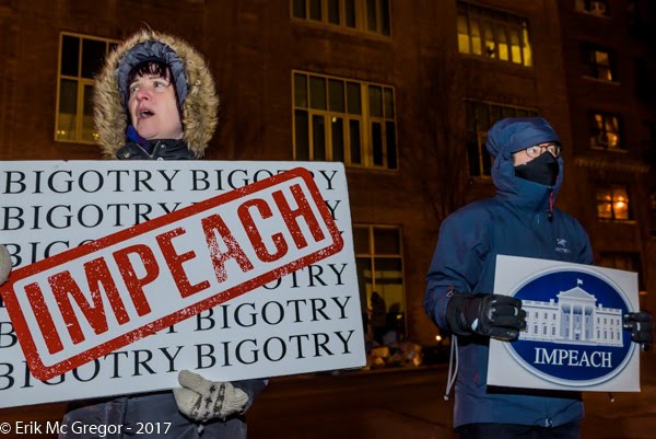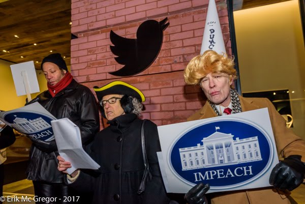 New York, NY – Inspired by an impeachment article of Rep. Al Green (TX) and the sentiments of several other U.S. Congress members, direct action group Rise and Resist and NYC residents held their Weekly Impeach Protest at the Twitter headquarters in Manhattan on December 28, 2017; committing to protest every Thursday until he’s gone from The White House.