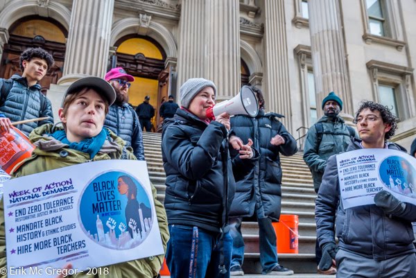 New York, NY – Amidst allegations of overt racism at several city schools, the #BlackLivesMatterAtSchool Coalition held an after school rally on February 13, 2018; at the steps of the Tweed Courthouse, to demand a forward-thinking change in policies that uphold systemic racism in our schools. Black Lives Matter At School demands were delivered by the organizers to the New York City Schools Chancellor, Carmen Fariña.