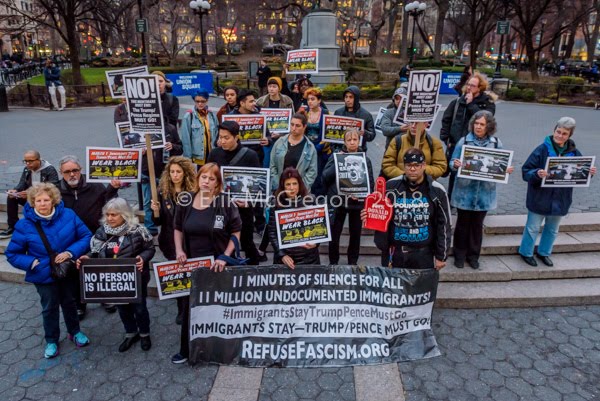New York, NY – As part of a nationwide campaign, activists gathered at Union Square Park on March 1, 2018 and held 11 minutes of silence for all eleven million undocumented immigrants affected by the Trump administration nefarious immigration policies. The demonstrators stood in silence wearing black to show their stance against round-ups, mass deportations, targeting of immigrants’ rights leaders, and Trump’s border wall.