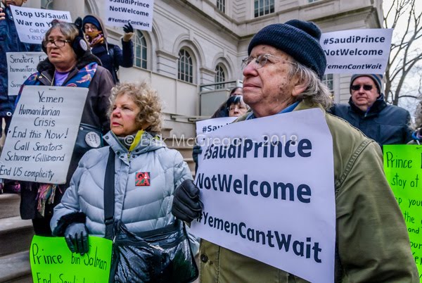 Today the Saudi Crown Prince, Mohammed bin Salman, is meeting President Trump. Meanwhile, the Senate may vote today on ending US support for the Saudi war on Yemen. The prince will travel to NYC next week. This morning activists protested at NY City Hall and the White House.