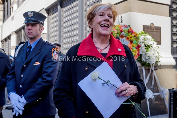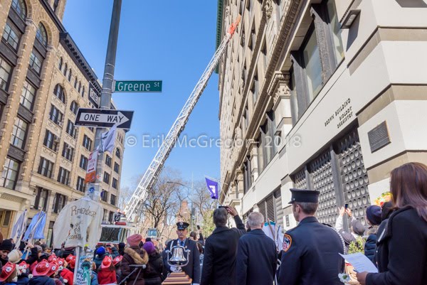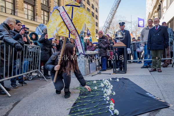 The commemoration began with a musical tribute from the New York City Labor Chorus, and from the singers of Onsite Opera’s Morning Star. The names of the workers who perished during the blaze were read aloud, and flowers were laid at a makeshift memorial as while a bell tolled, rung by the Fire Department of New York.