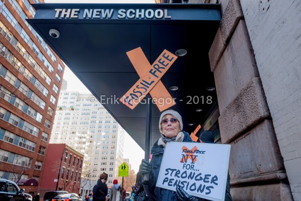 New York, NY – Members of the campaign to Divest New York State’s pension funds from fossil fuel holdings held a picket outside Arnhold Hall at The New School in Manhattan, on March 26, 2018; where New York State Comptroller Thomas DiNapoli discussed the future of the 6 billion dollars in pension funds.