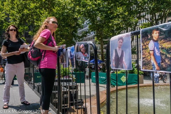 New York City – Responding to a call from Palestinian Civil society, a small group of NYC-based activists have come together at Bryant Park on July 20, 2018 in solidarity with Palestinians’ Great March of Return in Gaza, showcasing photos and sharing stories of those killed during the protests along the Gaza Strip border fence by Israeli Defense Forces.