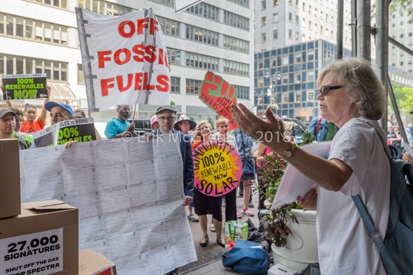 Sponsoring organizations including Sane Energy Project, Resist Spectra, Food & Water Watch, New York Communities for Change, The Climate Mobilization NYC, NYPIRG, United For Action, 350Brooklyn, 350NYC, People’s Climate Movement – New York, Democratic Socialists of America – NYC chapter, organized a rally outside Cuomo’s Manhattan office on August 16, 2018, calling on him to stop fossil fuel infrastructure and shift New York to 100 percent renewable energy and delivered thousands of petitions to Governor Cuomo, urging him to be a true climate leader.