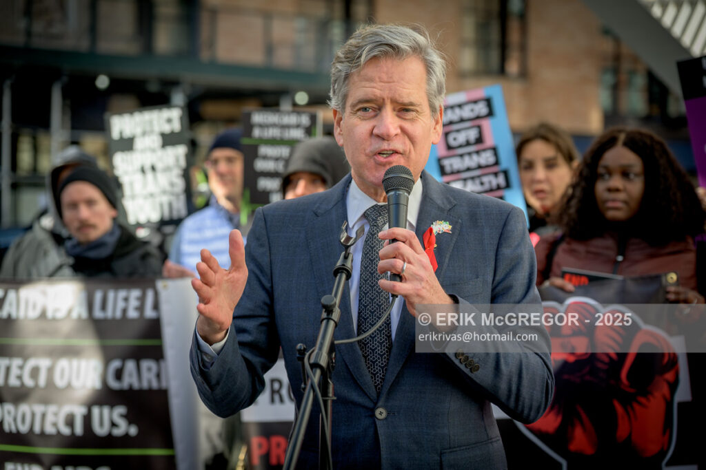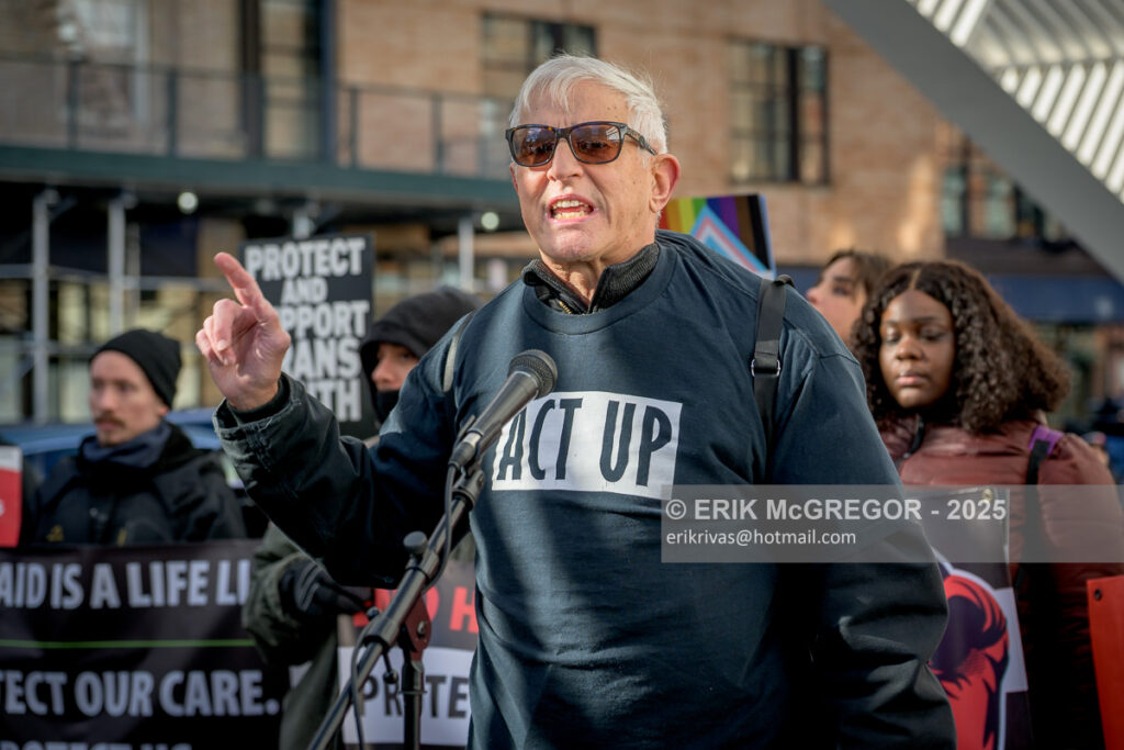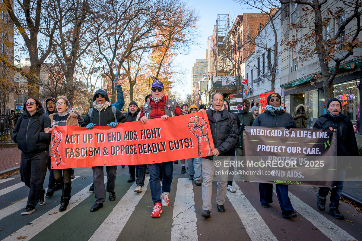 New York, NY — On World AIDS Day, December 1, 2025 AIDS advocacy organizations, elected officials, leaders in the fight to end AIDS and activists gathered at the New York City AIDS Memorial Park at St. Vincent’s Triangle (76 Greenwich Ave, Manhattan) to hold a rally, demonstration and march denouncing the Trump Administration’s deadly budget cuts, and authoritarian attacks on free speech, assembly and protest – bedrocks of our country that were used by AIDS activists in the 80s and 90s to save millions of lives at home and abroad.